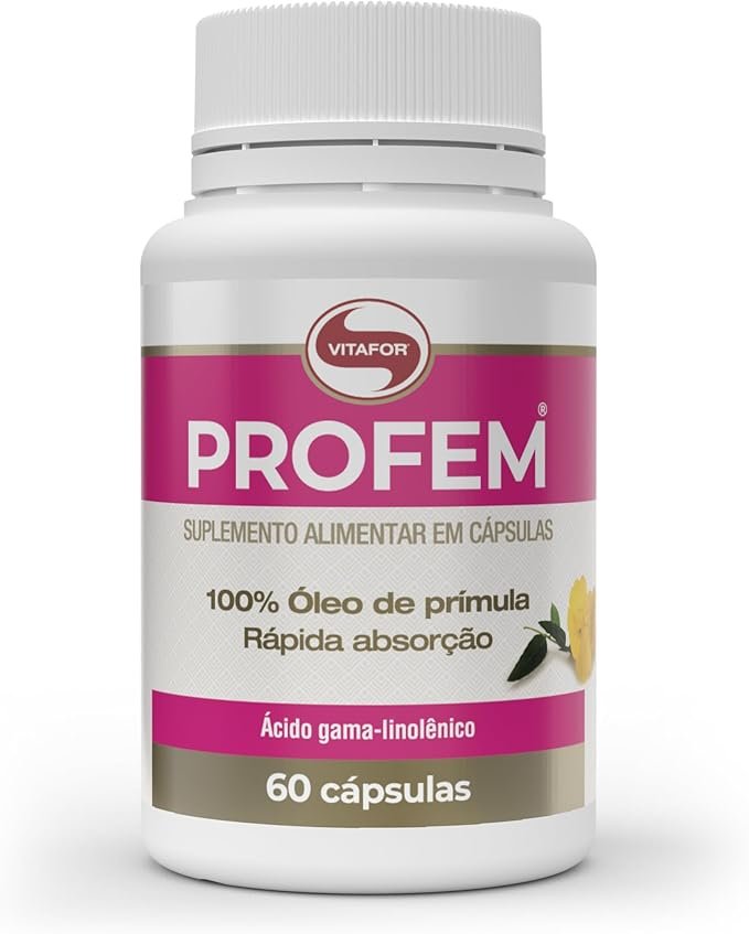 Profem Óleo de Prímula Vitafor (60 cápsulas) é fonte natural de ácido gama-linolênico (GLA) e ômega 6, auxiliando no equilíbrio hormonal feminino, saúde da pele, bem-estar na TPM e no envelhecimento saudável, com praticidade e alta qualidade Vitafor.